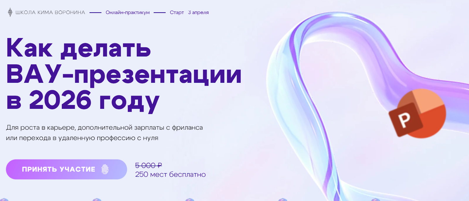 Основное направление, которое предлагает Ким Воронин – это курс по презентациям Ниндзя. Для старта предлагается пройти бесплатный практикум. С большой долей вероятности бесплатная программа создана для рекламы и сбора контактных данных потенциальных учеников онлайн-школы school kimvoronin com.