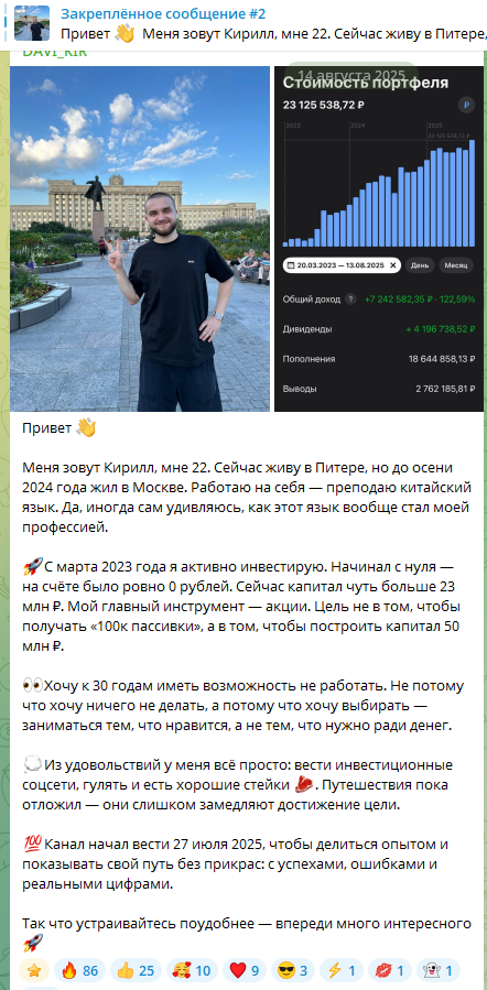 Автор ведет блоги в различных социальных сетях: ФинБазар, Смарт-Лаб, Телеграм и др. Кирилл заявляет, что в 22 года смог заработать миллионы, но не за счет трейдинга, а благодаря знанию китайского языка, который он изучал с детства. Заработок он вложил в инвестиции, а к 30 годам планирует выйти на пассивный доход.