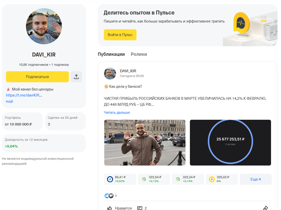 Но в то же время у автора есть страница на Пульс. По портфелю видно, что эксперт действительно располагает капиталом от 10 миллионов, но на сегодняшний день годовая доходность портфеля не самая высокая – 9%. Это даже ниже ставки по вкладам.