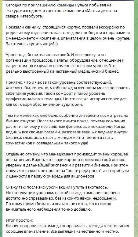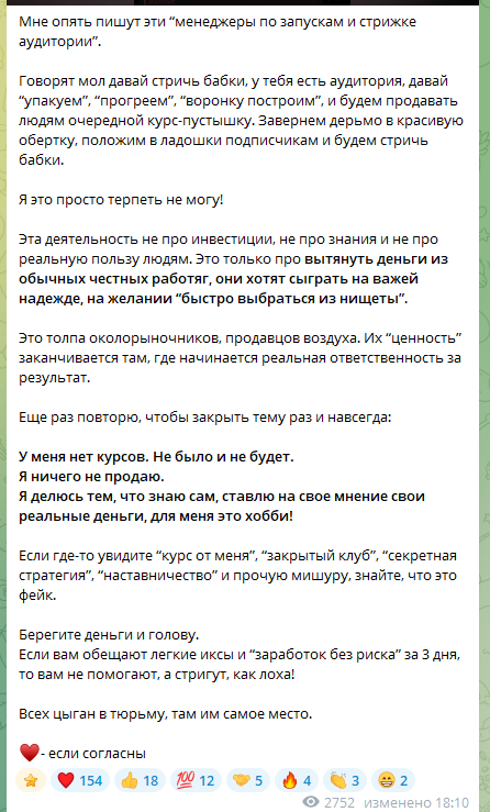 При проведении обзора автор не предлагает своих услуг по обучению инвестициям, не продвигает ВИПки. Напротив, он отметил, что подобные темы ему неприятны, а блог – это просто хобби.
