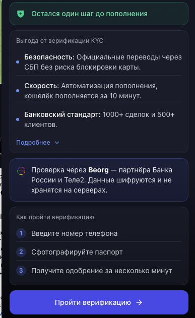 Что касается обменного курса, то он примерно на 1 рубль отличается от курса ЦБ. Если считать это в %, то речь заходит примерно о 8-9% разницы с банковским. Если пройти верификацию и пользоваться ботом, то в целом можно и не думать о такой разнице, ведь многие обменники выдают куда менее выгодные курсы.