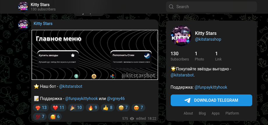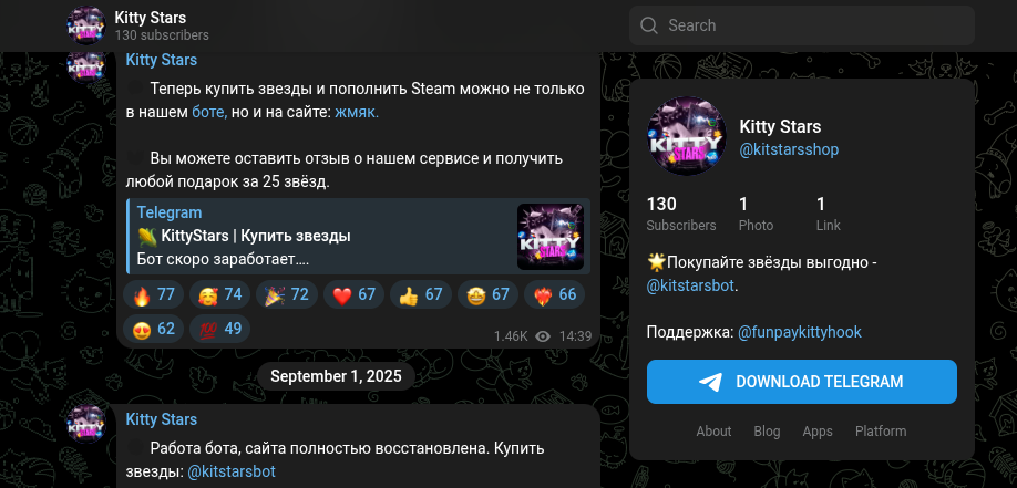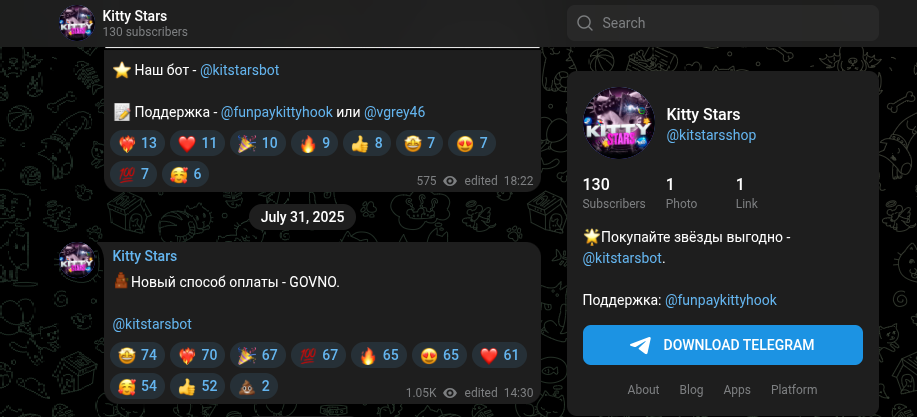 Официальный паблик в ТГ «Китти Старс» стартовал в июле 2025 года, но активность в нем прекратилась почти мгновенно. За все время работы канала админы сподобились выпустить ровно восемь постов. Последняя публикация датирована октябрем того же 2025 года, после чего комьюнити буквально умерло. Создавать качественный контент авторы явно не планировали, их расчет строился на привлечении случайного трафика и неопытных пользователей.