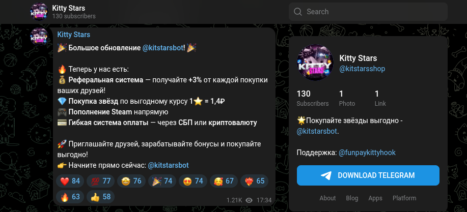 Отзывы про тг-бот «Kitty Stars | Купить звезды» и обзор канала в ТГ «Китти Старс»