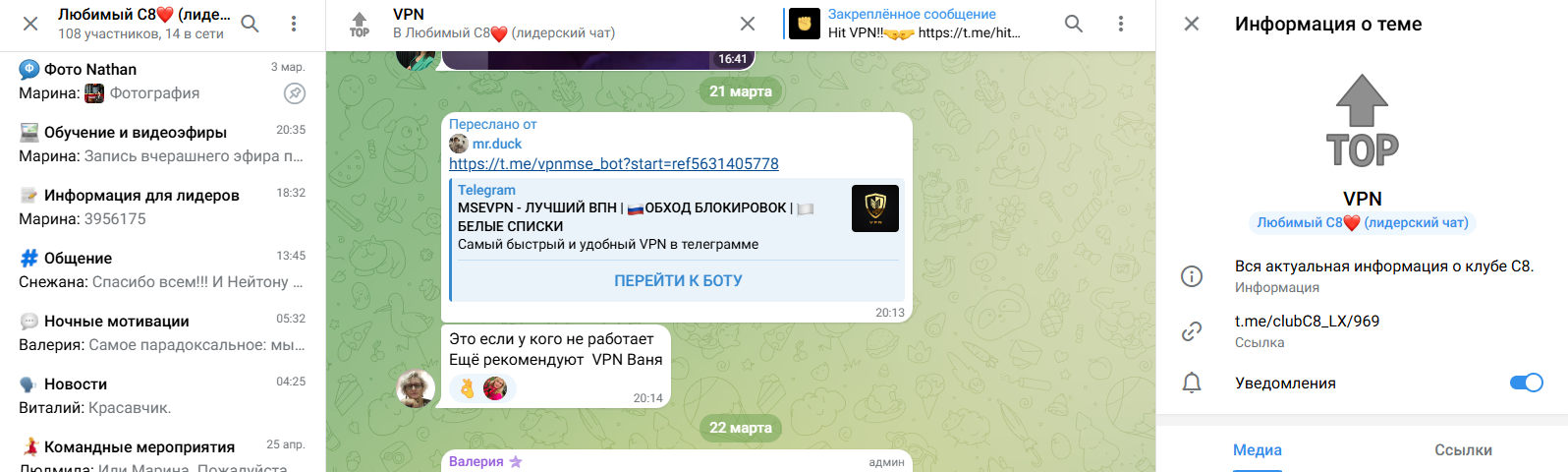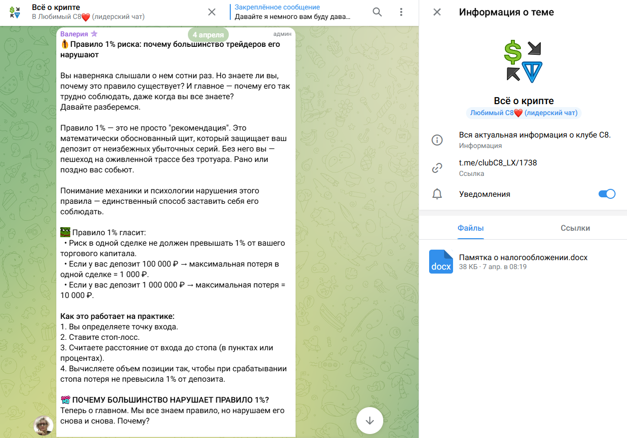 Помимо сообщества Вконтакте, удалось найти сразу пару крупных групп в телеграм по криптовалюте, связанных с клубом С8, где людям дают советы по инвестициям, прямые сигналы и памятки: как не слить депозит, психология, правила 1% и прочая база, которая буквально звучит в каждом ролике на YouTube по теме трейдинга.