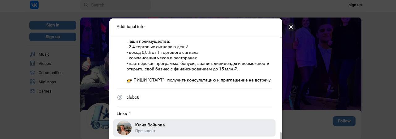 Основной источник дохода в клубе, это якобы торговля по сигналам на криптовалютном рынке, что уже расходится с ее описанием в bio про помощь в масштабировании бизнеса. Вдобавок у девушки нет экономического образования и опыта в торговле. Один из ее профилей — психология, девушка местами напоминает инфоцыгана или очередного таролога/гадалку из-за модели поведения. Нередко под трейдинг маскируют сомнительные платформы и финансовые пирамиды, ведь участники не разбираются в деталях работы.