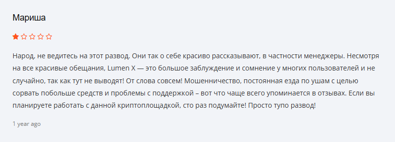 Однако ситуация с крипто биржей LumenX, которая активно продвигается командой, обладает негативной репутацией. Пользователи прямо связывают ее с деятельностью клуба, обвиняют в мошенничестве. На платформе людям рисуют заработок на счету, а затем заставляют оплатить комиссию, налоги, вплоть до 30% от депозита каждый. Дополнительно отмечают работу без лицензий, красивые обещания от менеджеров, без гарантий и подтверждений.