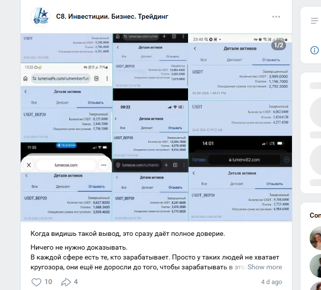Дополнительно команда называет себя партнером криптовалютной биржи и именно здесь возникают первые вопросы. Та самая платформа, которую поддерживает клуб С8, называет LumenX, при этом фиксированного домена в сети нет, команда постоянно создает зеркала: Lumenx22 com, Lumxcn com, Lumenxa7b com и десятки других адресов. Это первый красный флаг, нормальная компания с лицензиями и регуляцией не будет создавать копии, ведь это повышает риск подделки, фишинга и скама от их имени. Обычно именно мошенники и переезжают с адреса на адрес из-за блокировок/ограничений, что ставит надежность С8 Клуба под сомнение.