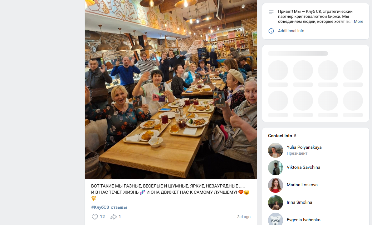 Клуб С8 публичные и верифицированные отзывы в сети не собирает, поэтому неизвестно, правда ли это лохотрон. В сообществе ВК можно заметить крайне хвалебные оценки, некоторые из них записаны в видео формате, но они буквально опубликованы командой, а значит с высокой вероятностью накручены. Это обычная практика для подобных инвестиционных компаний.