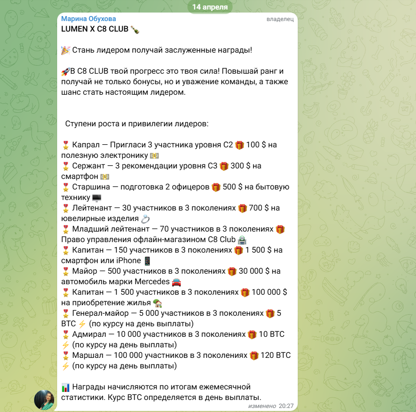 В отдельной теме с сигналами, встречается лишь непонятный набор цифр. Что это, номер сделки, какой-то иной способ идентификации — непонятно. Дополнительно есть информацию по регистрации, обязательным условием является использование чужого реферального кода и подтверждение менеджером в социальных сетях. Это признак финансовой пирамиды, крипто Клуб С8 контролирует поток входящих участников, а на заработок сильно влияет личный рейтинг, количество приведенных рефералов.