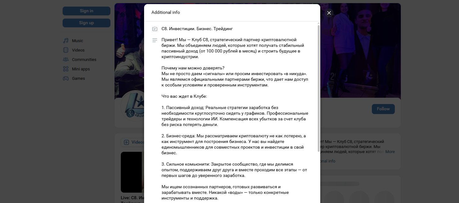 По словам разработчиков, они объединяют людей, которые хотят выйти на пассивный доход от 100 000 рублей в месяц. Клиентам обещают стабильный заработок и будущее в криптоиндустрии, но вся деятельность ограничена сообществом Вконтакте “С8 Инвестиции Бизнес Трейдинг”. Нет ни сайта, ни примеров договора.