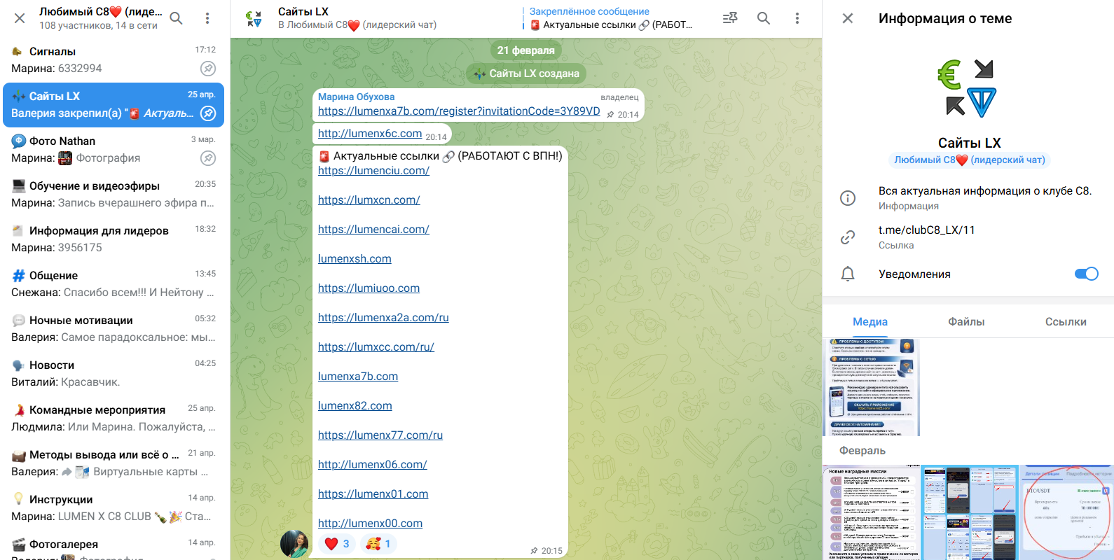 Отдельно подтверждается факт связи с сомнительной биржей LumenX, где перечисляются ссылки на зеркала, мероприятия, способы обхода блокировок и список VPN. При этом популярность крайне низкая, всего 108 подписчиков, против 572 участников Вконтакте.