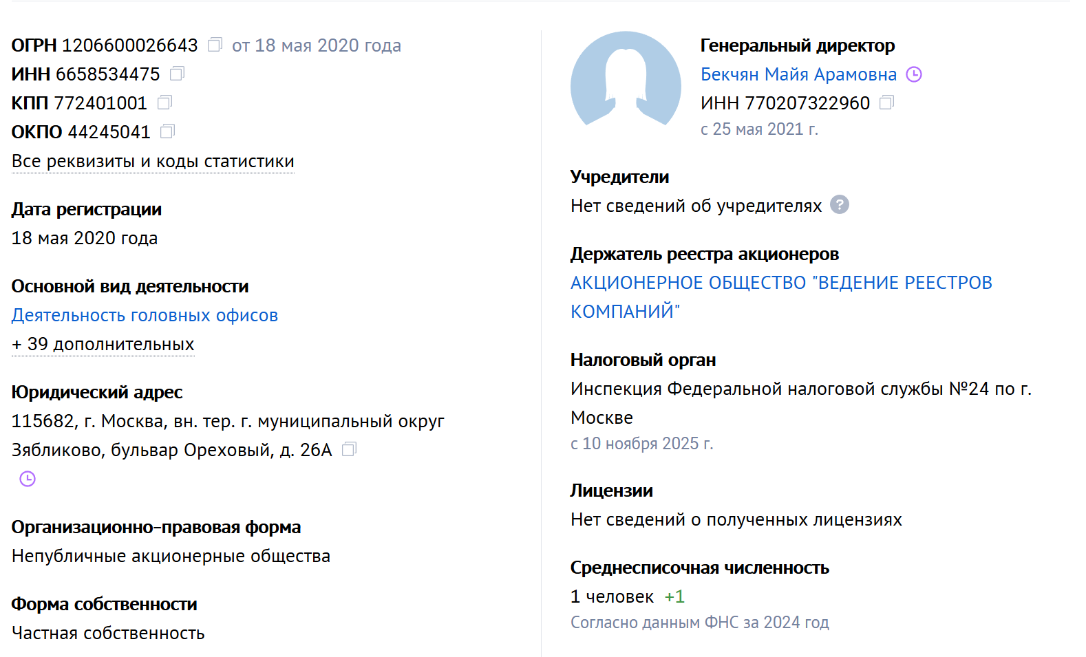 Проверка компании показала, что она работает под названием АО «КМГА МЕДИНВЕСТ ГРУПП». В роли генерального директора выступает некто Бекчян Майя Арамовна. Фирма зарегистрирована 18 мая 2020-го. Основное направление — деятельность головных офисов. Уставной капитал составляет 6 млн рублей.