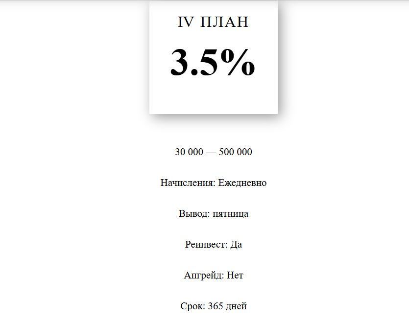 - Первый — от 700 до 2999 р. Предусматривает доходность на уровне 1,3%. В этом тарифе пользователи могут рассчитывать на ежедневные начисления денег и вывод раз в неделю по пятницам. Есть возможность реинвестирования и апгрейда. Срок вложений — год.
