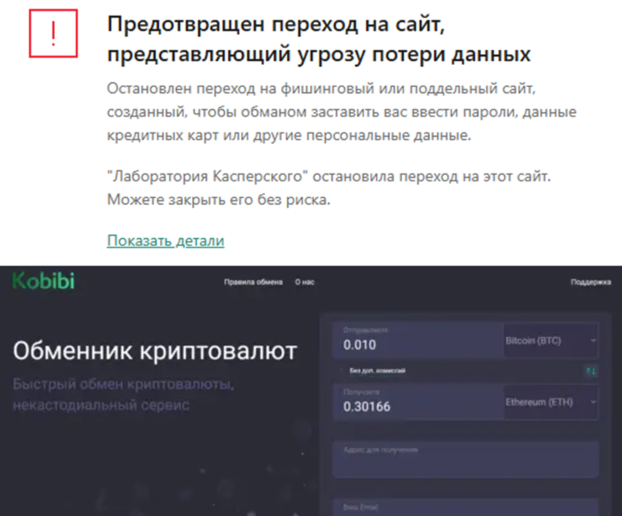 Площадка в виде обменника и кошелька открывает доступ к операциям с монетами и токенами. Вы можете здесь покупать и продавать разные валюты, превращая один вид активов в другой без сторонних сервисов. Для хранения встроен внутренний кошелек, но какой у него тип – неясно, что говорит о наличии потенциальных рисков. Известно только то, что сервис Kobibi Exchange является некастодиальным. О трудностях сообщают и антивирусники, не подпускающие пользователей к сайту из-за подозрений в краже данных.