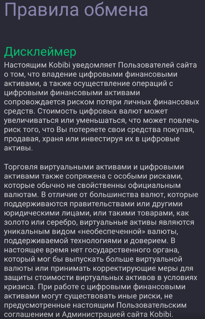 Как мы уже сказали, в Сети нет реальных отзывов о данном проекте. Некоторые эксперты говорят, что обменник создан мошенниками, но аргументов в эту пользу они не приводят. Упоминания об обменнике редко где встречаются, хотя сервису уже год. Напомним, что представители качественных платформ всегда приводят данные о себе и сведения о курсах и других торговых условиях, но здесь этого нет. На сайте Kobibi com присутствуют лишь правила обмена, но хотя бы с предупреждениями о рисках.