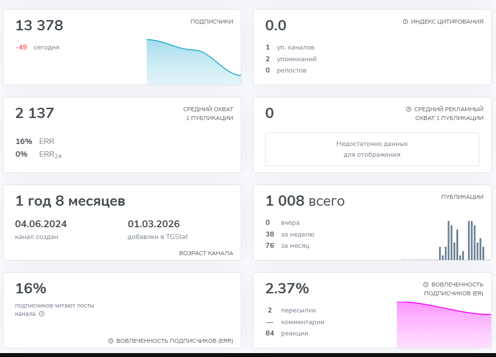 На канале в Телеграм более 13 000 подписчиков, но показатели указывают на накрутку, так как индекс цитирования нулевой, посты просматривать только 16% аудитории, а вовлеченность не доходит даже до 3%. Проект запустили 04.06.2024, но в марте 2026 года пользователи уходят, причем по графику видно, как за последний месяц он почти не изменился.