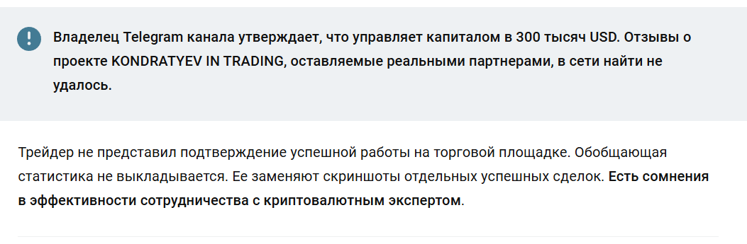 В описании указано, что у владельца проекта депозит превышает $300,000, но никаких подтверждений этому нет, а также неизвестно, действительно ли трейдер умеет торговать на бирже, ведь верифицированная статистика отсутствует. Автор утверждает, что его зовут Михаил Кондратьев, но это единственная базовая информация, которая есть в открытом доступе.
