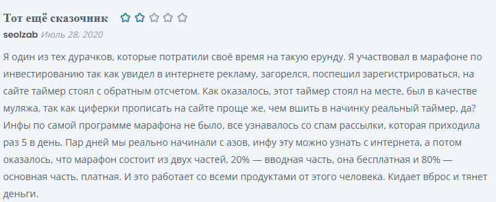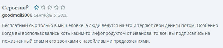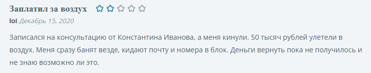 Один из пользователей в своем отзыве о Константине Иванове признает, что ошибся, купив его курс. В первой части программы мошенник рассказывал общедоступную информацию, а во второй требовал дополнительных денег за продвинутое обучение.