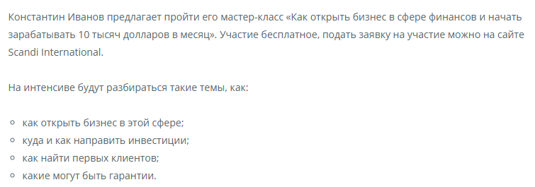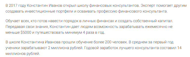- Иванов предлагает сказочную прибыль от «финансовых консультаций», которые якобы способен проводить кто угодно после короткого обучения;