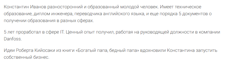 На сайте Investcourses Ru опубликована биография Иванова. Автор утверждает, что у этого «гуру» есть дипломы инженера и переводчика с английского языка. Мы не видим никакой связи его образования с деятельностью по предоставлению финансовых консультаций, что настораживает.