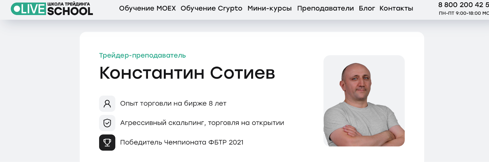Константин Сотиев является преподавателем в «Школе трейдинга Schoollive», которая входит в группу компаний Live Investing Group. Согласно представленной информации, его опыт торговли на бирже составляет 8 лет, а специализация – агрессивный скальпинг и торговля на открытии. Также он заявляет о победе в Чемпионате ФБТР 2021 года.