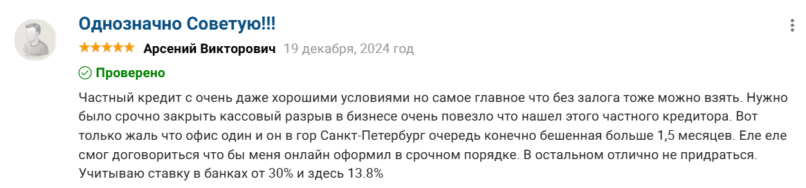 Пользователи указывают приблизительно одинаковые проценты – от 12% до 14% годовых, причем банки выдают кредиты в 2025 году в среднем по 18-20% годовых, а в МФО ставка еще выше, поэтому сотрудничество с инвестором выглядит достаточно выгодно. Некоторым клиентам предлагают оформить все онлайн, но здесь все зависит от того, какое решение примет Коршаков Олег Семенович, поэтому большинству заемщиков все же приходится посещать офис.