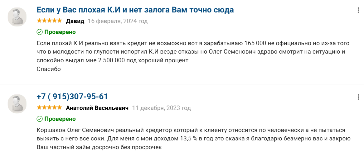 На сентябрь 2025 года пользователи написали десятки комментариев, причем большая часть отзывов об инвесторе Коршакове Олеге Семеновиче положительная. Клиенты благодарны за предоставленный займ, хотя у многих были долги и испорченная кредитная история, но теперь их месячный платеж снизился, что позволило вздохнуть спокойно.