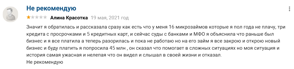 Есть только один отрицательный отзыв, где девушка рассказывает, что ей отказали из-за самой ужасной и плохой финансовой ситуации, с которой сталкивался Олег. Вопрос стоял о сумме ₽45,000,000, причем у девушки уже было три кредита, 16 микрозаймов и пять кредитных карт.