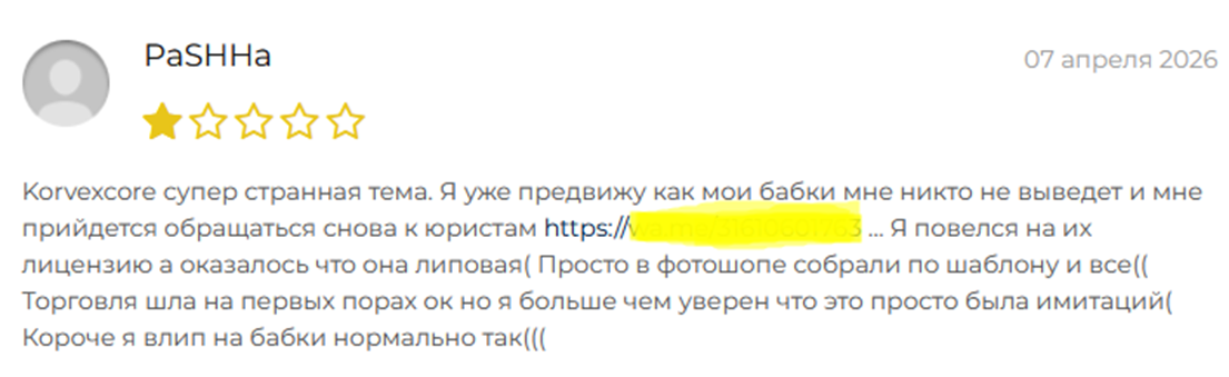 Korvexcore обещает высокие доходы и профессиональную аналитику, но на деле это пустые слова. Отсутствие лицензий, анонимность владельцев и непрозрачные условия торговли говорят сами за себя. Многочисленные жалобы пользователей подтверждают, что это очередной скам-проект, созданный для выкачивания денег.
