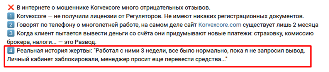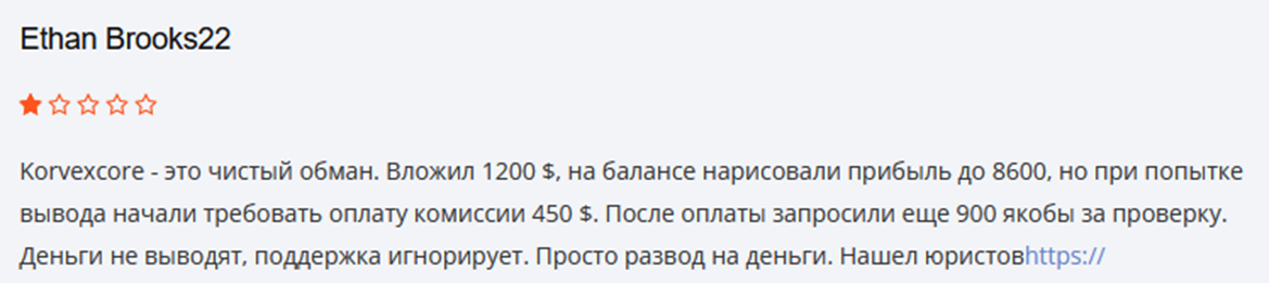 О том, что Korvexcore com – это развод, говорят многие обманутые трейдеры. Бывшие клиенты брокера утверждают, что за вывод могут потребовать высокие комиссии, хотя в условиях они нигде не прописаны.