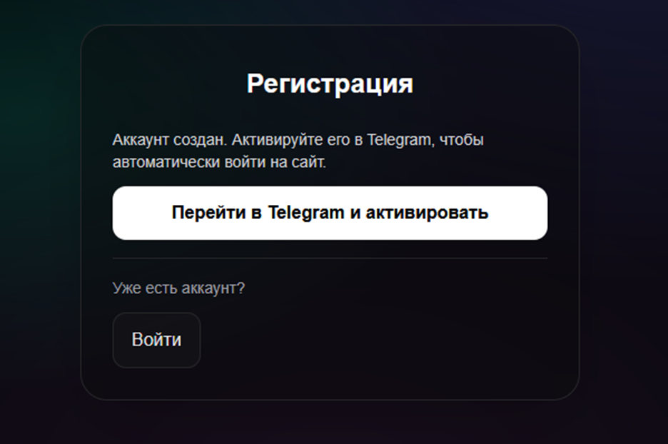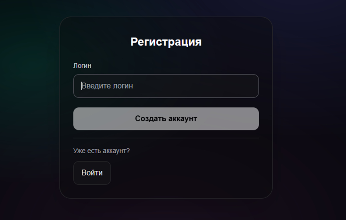 Пользователя встречает пустая страница с формой для регистрации или входа в аккаунт. Для открытия нового кабинета надо придумать и указать логин. Активация возможна только через Телеграмм.