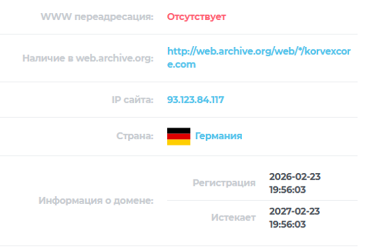 Проверка сайта показывает, что никакой многолетней истории нет. Домен был зарегистрирован 23 февраля 2026 через IP в Германии. Владельцы платформы КорвексКоре скрыты, сохраненных архивных данных нет.