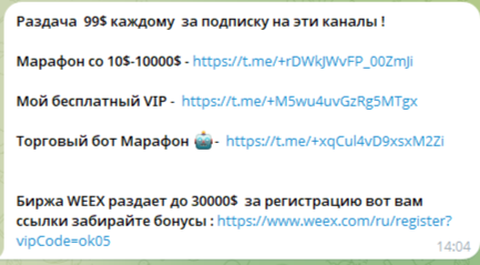 Сообщество специалиста закрытое и для входа в него понадобится подать заявку. Ее одобряют сразу, после чего на связь выходит бот. Он встречает подписчика приветственным сообщением и предложением получить $99 после подписки на следующие каналы: