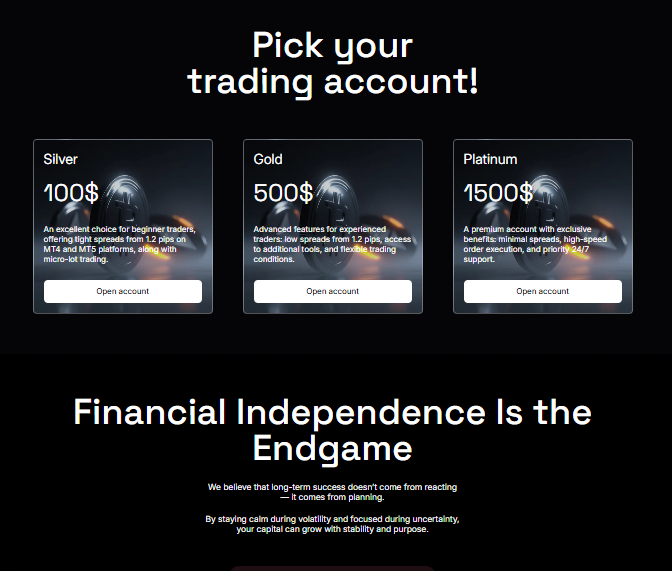 Тем не менее описания не сопровождаются деталями о комиссиях, минимальных требованиях к обороту или механизмах открытия счетов. Ссылки на открытие счета ведут на страницы без реальной или интеграции с платежными системами.