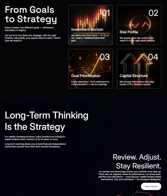 Акцент делается на создании персонализированных стратегий для финансового планирования. Компания якобы помогает инвесторам достигать целей, таких как подготовка к выходу на пенсию, финансирование образования или передача наследства: