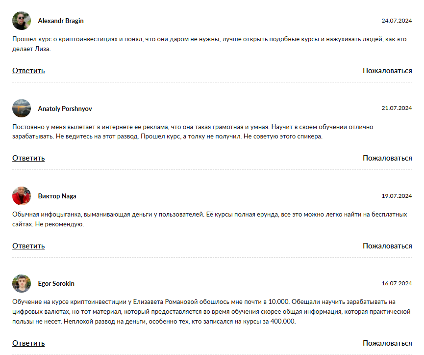 Отзывы о Крипто Шике как о самостоятельном продукте отсутствуют. Вместо этого в сети встречается множество комментариев о курсах Романовой и Любимовой — и они преимущественно отрицательные. Пользователи пишут, что обучение не содержит практической ценности, информация поверхностная, а главный акцент делается на мотивации и продаже дорогих пакетов.