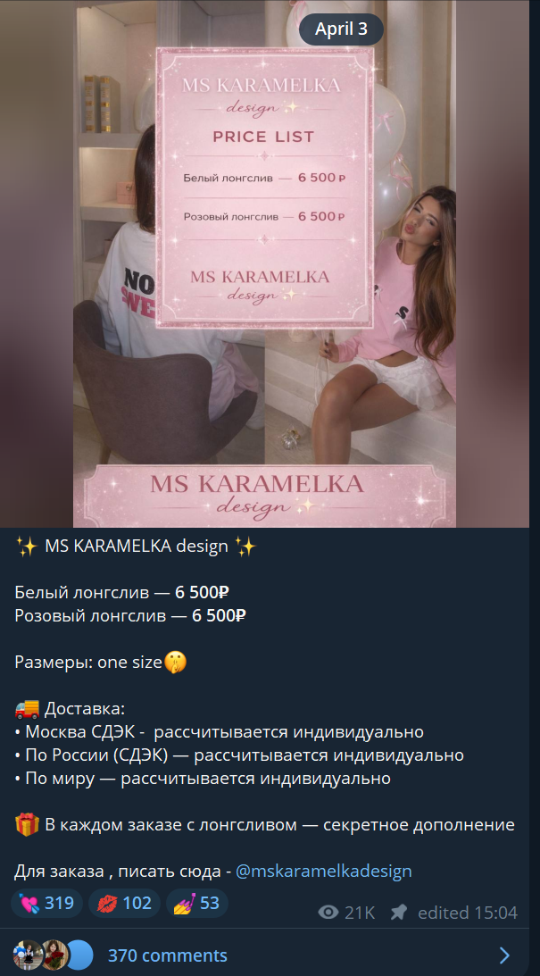Тг-магазин MS Karamelka design – это бренд одежды блогера с основным товаром в виде двух лонгсливов. Однако отзывы о качестве товара и платформе https t me krisssskaram заставляют усомниться в надежности товара. Действительно ли магазин помогает купить одежду – разобрались в обзоре.