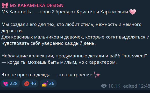 В описании аккаунта указано, что сообщения принимаются только по поводу заказа лонгсливов. Вся переписка ведется через менеджеров, а не лично Кристиной Карамелькой. Первый анонс о запуске бренда MS Karamelka design появился 27 марта 2026 года.