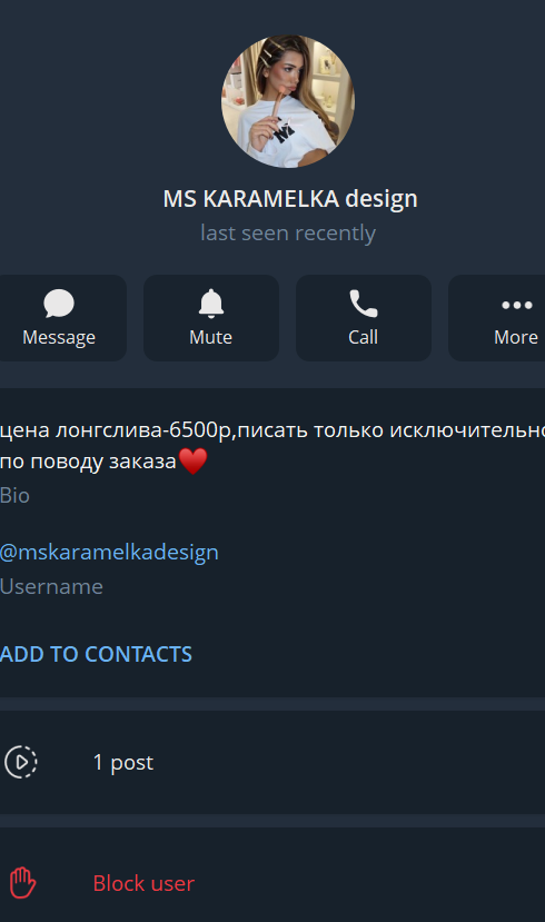Контактные данные MS Karamelka design ограничены аккаунтами в мессенджере. Основной канал бренда расположен по адресу krisssskaram. Там публикуются анонсы, описание коллекции и общая информация. Для оформления заказов покупатели должны писать в личные сообщения mskaramelkadesign.
