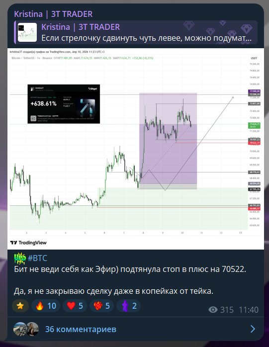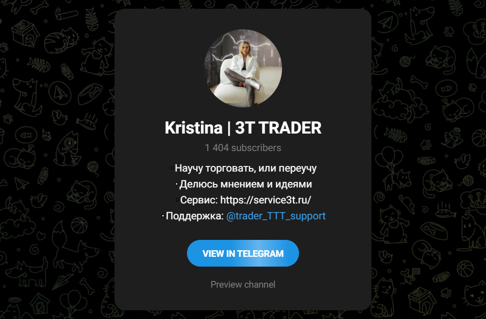 Kristina 3T Trader — Телеграмм-канал, автор которого торгует криптовалютой, предлагает платное обучение и закрытый канал с аналитикой. Трейдерам она обещает возможность сэкономить на комиссиях бирж.