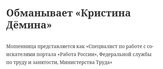 Кристина Демина — персонаж без подтвержденной личности, действующий под прикрытием государственного ведомства и предлагающий через Телеграм помощь в трудоустройстве и удаленный заработок. Никакого отношения к официальным структурам по типу Работа России, Роструд и Министерства труда этот аккаунт не имеет. Схема построена на доверии к государственным «брендам» и рассчитана на людей, которые активно ищут работу. Результат для тех, кто вступил в переписку и выполнил просьбы, потеря денег и персональных данных.