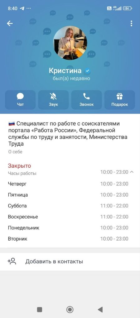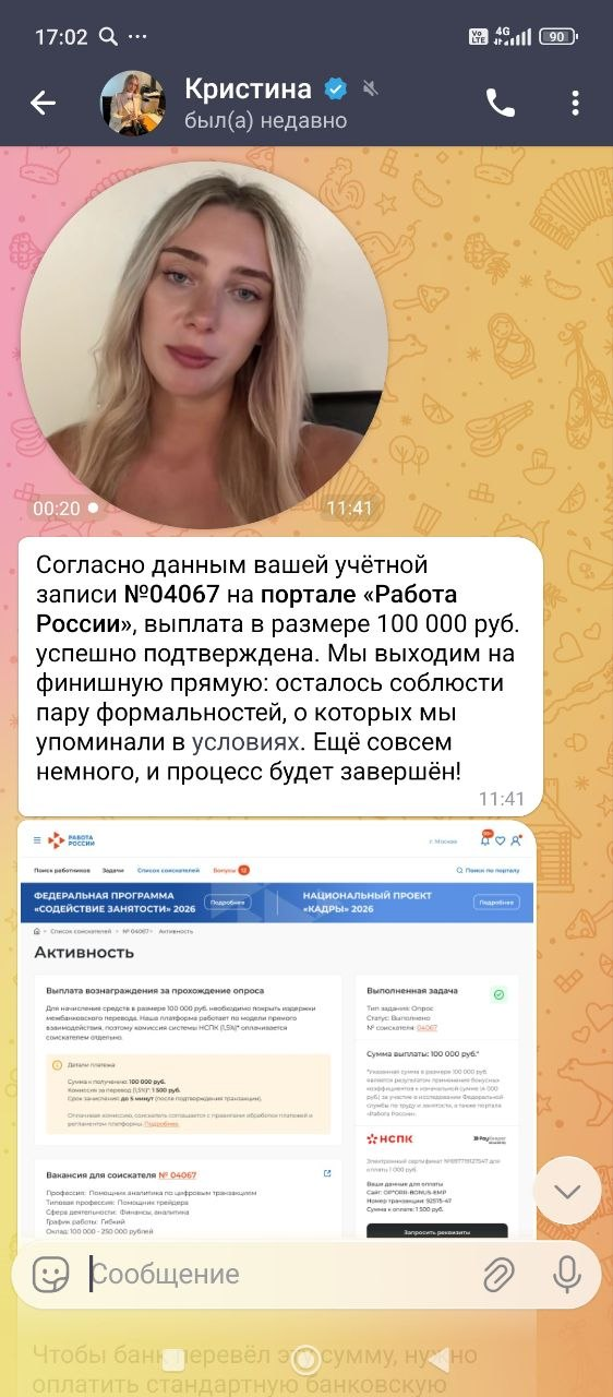 Кристина Демина работает через ТГ. Представляется, как Специалист по работе с соискателями портала Работа России, Федеральной службы по труду и занятости и Министерства труда. Это звучит убедительно — государственные структуры вызывают больше доверия, чем анонимные аккаунты. Именно на этом доверии и строится вся схема.