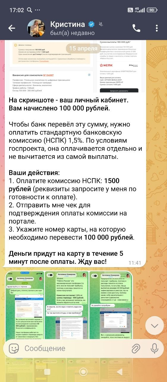 Первые шаги выглядят безобидно. Общение ведется вежливо, структура переписки имитирует официальный стиль. На каком-то этапе появляется просьба — предоставить персональные данные, заполнить анкету и «оплатить комиссию НСПК:1500 рублей». Именно здесь и заканчивается сценарий, деньги уходят на счет физлица, контакт обрывается.