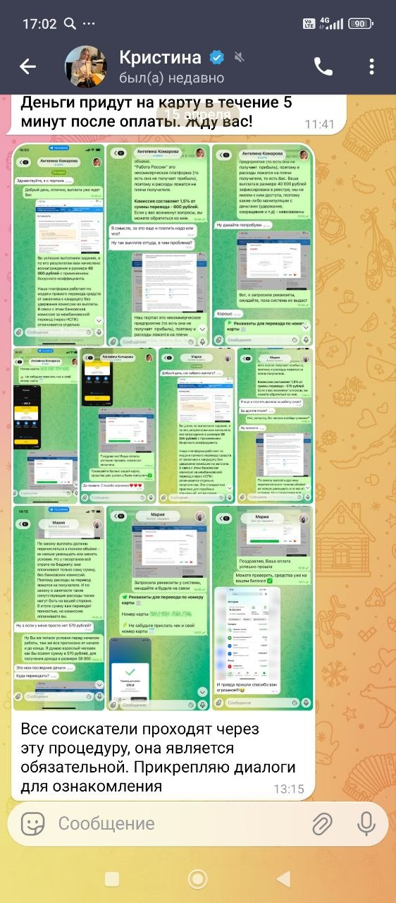 Стандартный сценарий работы подобных персонажей начинается с личного общения в Телеграм. Пользователю пишут якобы от лица представителя государственной службы занятости — предлагают подобрать вакансии, оформить документы для трудоустройства или получить доступ к закрытому банку предложений с удаленной работой. Или же человек сам находит «Кристину» через каналы с вакансиями.