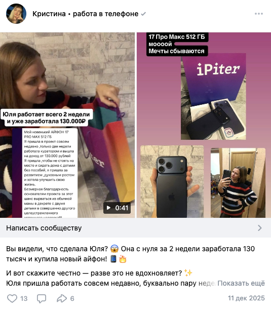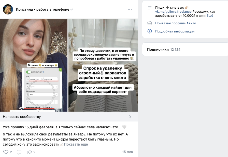 На страницу «Кристина работа в телефоне», которая во «ВКонтакте» находится по адресу gulieva freelance на 20 апреля 2026-го года подписаны 12,12 тысяч пользователей.