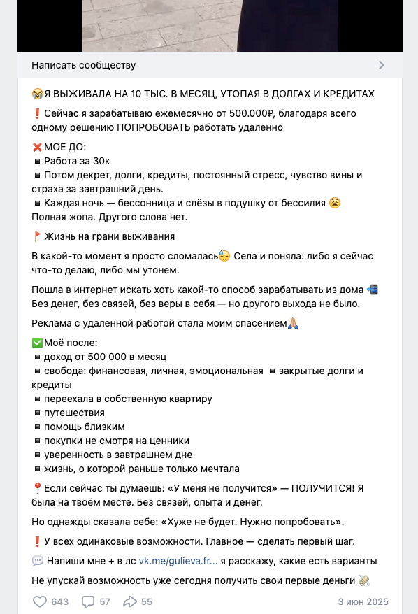 Проект «Кристина Гулиева Удаленная работа» отзывы в Сети не заслужил, что выглядит подозрительно, учитывая номинально большую аудиторию ее вк-страницы. Наша редакция решила разобраться в том, в чем причина данного несоответствия, а заодно проверить честность этого эксперта. С результатами разоблачения можете ознакомиться в обзоре ниже.