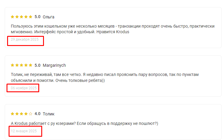Авторы купленных положительных отзывов о кошельке Krodus пытались создать иллюзию проверенного проекта. Получилось, что сервисом пользовались уже несколько месяцев тогда, когда и доменное имя не существовало.