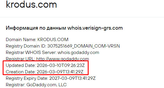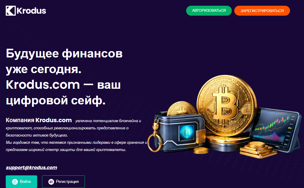 Сразу отметим, что на главной странице сервиса Krodus проект презентуется как признанный лидер в сфере хранения, предлагая широкий спектр защиты клиентских активов. Однако ресурс был запущен около месяца назад — доменное имя зарегистрировано 9 марта 2026 года.