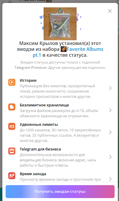 - Функциональные преимущества. Подписка позволяет Максиму загружать файлы объемом до 4 ГБ, быстрее отправлять сообщения и использовать эксклюзивные инструменты для ведения канала.