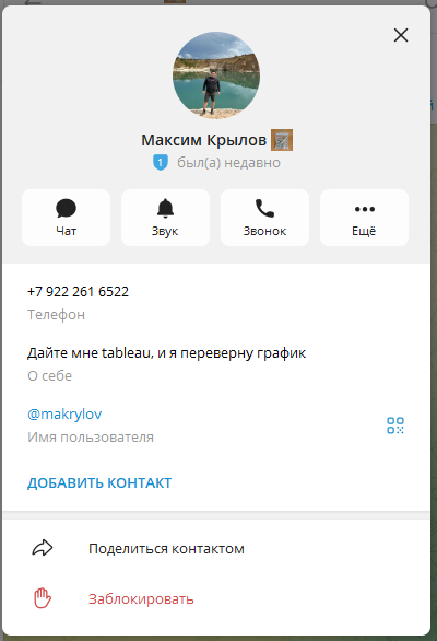 Канал в Telegram с именем makrylov содержит минимальный набор информации. В нем есть лишь имя, короткий рекламный слоган и кнопка для связи. Мы видим отсутствие подробных постов с отчетами, статистикой или регламентом работы.